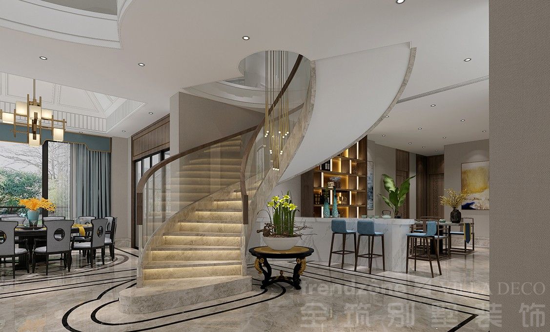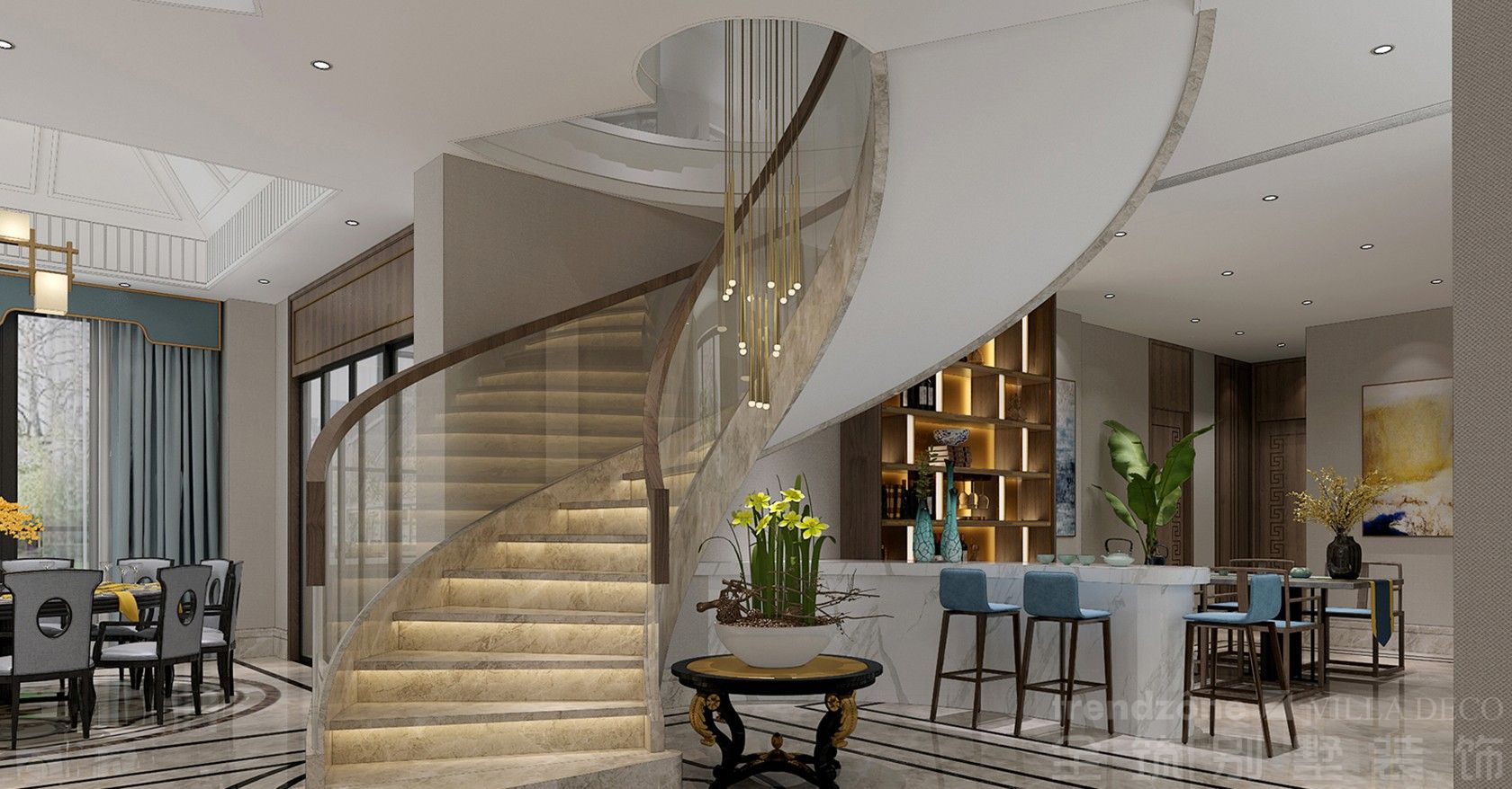新中式風格的客廳優雅簡約,造型對(duì)稱,通過(guò)對(duì)線條的使用讓空間更加開(kāi)闊,空間感得到加強。大的落地窗采光充足,旋轉樓梯更是絕妙。在清淨的空間與時(shí)間裡(lǐ),用平凡而樸素的物件,仔細訴說(shuō)對(duì)東方清雅生活意境的追求。