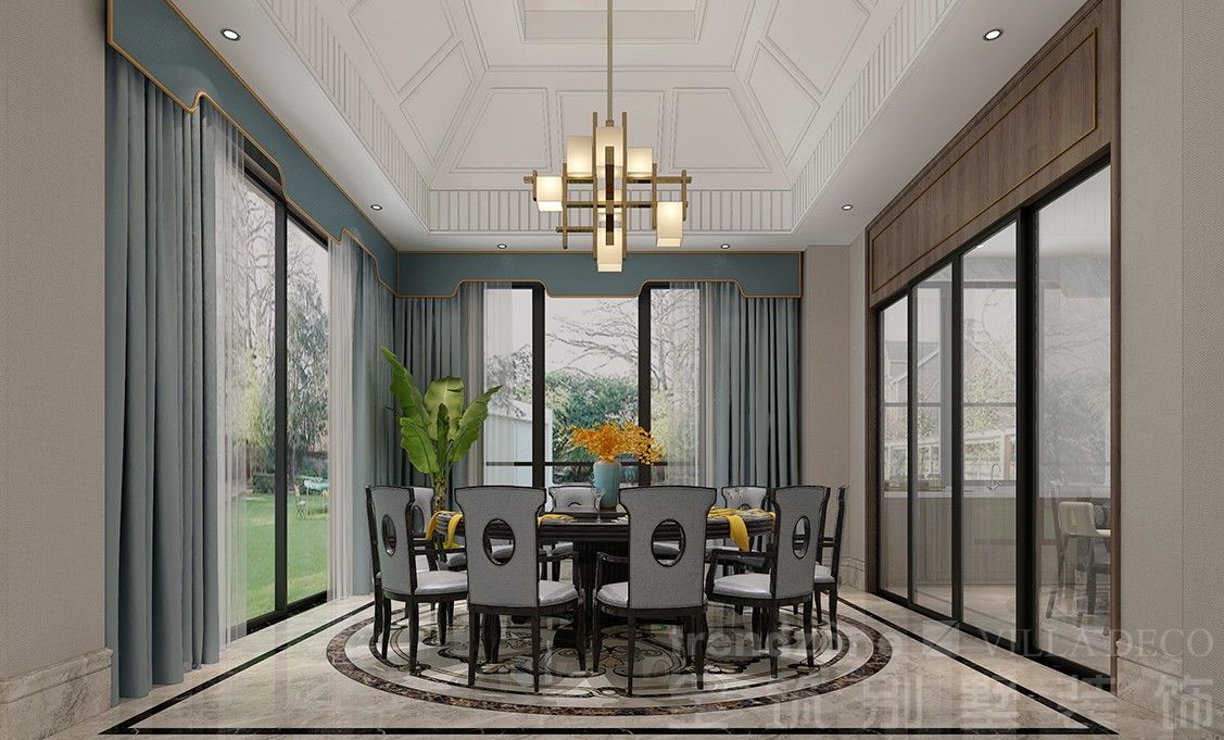 通過(guò)玄關進(jìn)入餐廳的第一眼就(jiù)被神韻的造型景觀俘獲;圓形的吊頂,方正的大理石地面(miàn)造型與“天圓地方”中式文化相呼應。