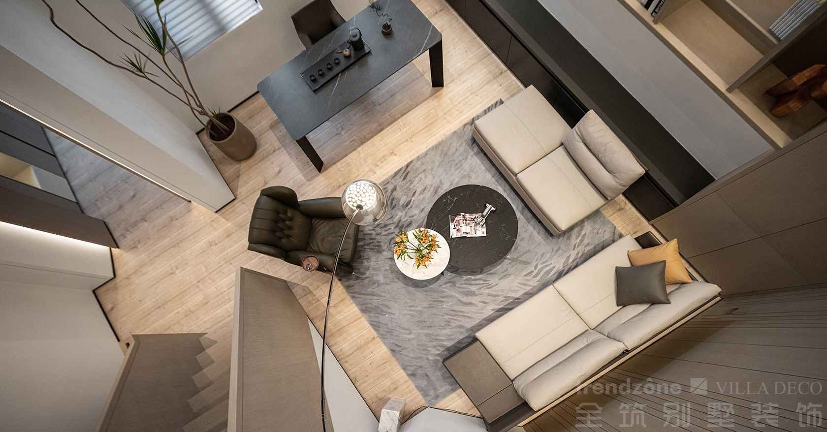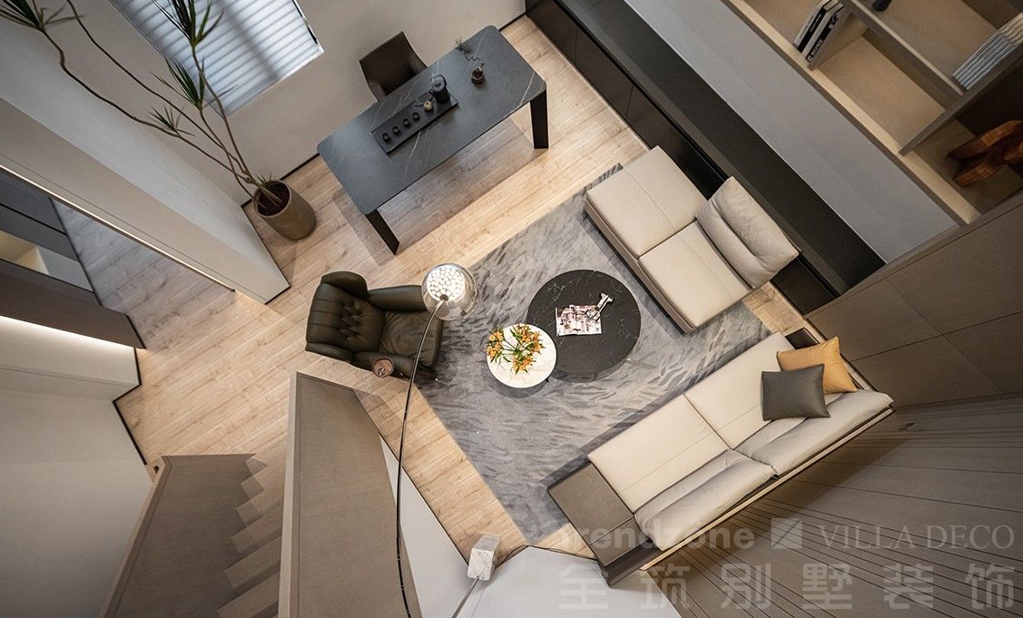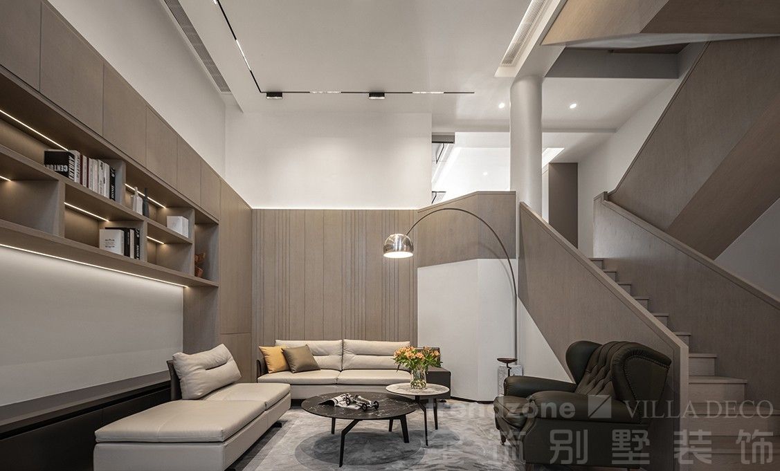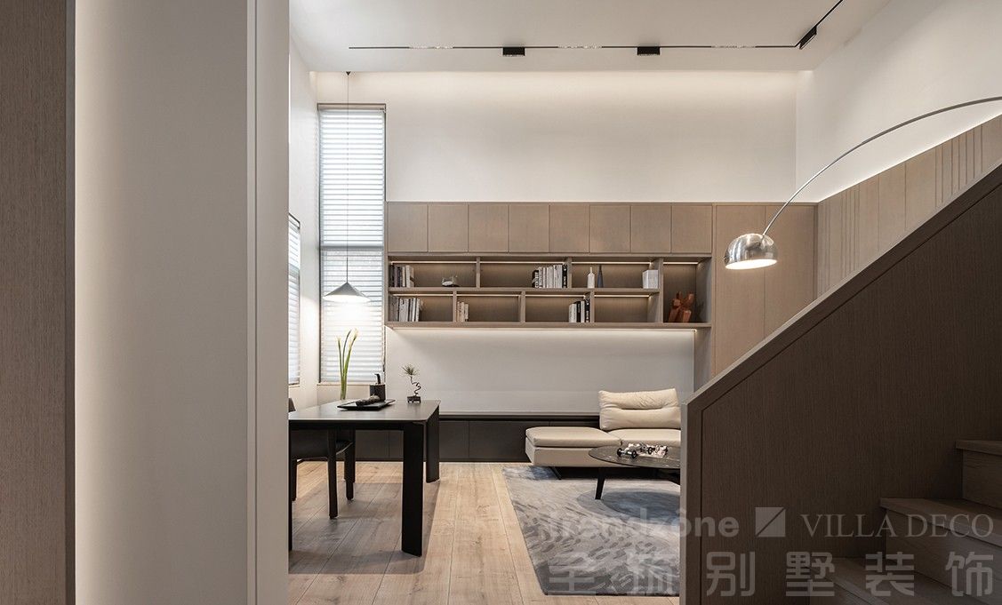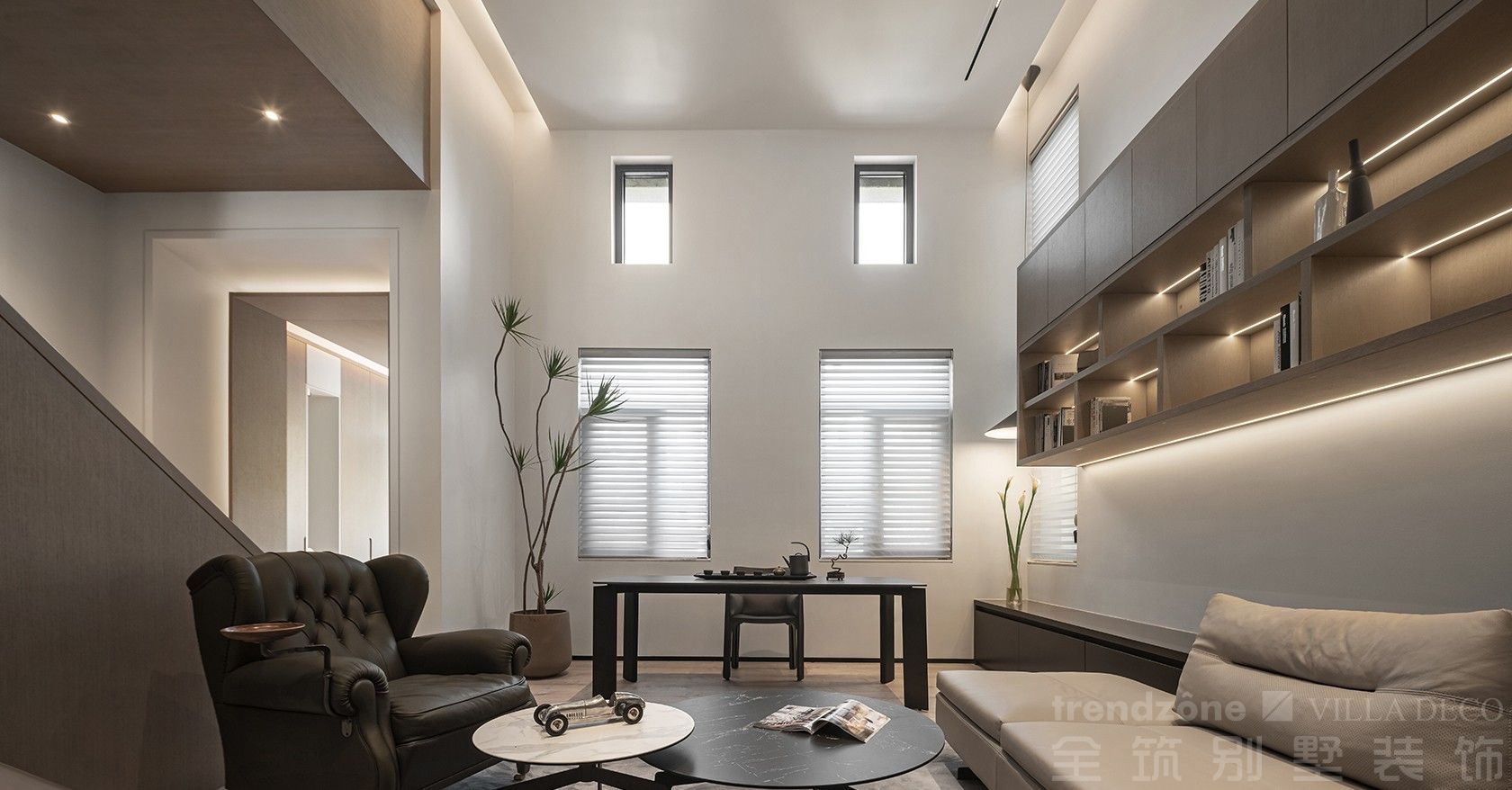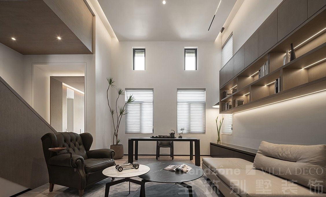 接近五米的層高,一進(jìn)門開(kāi)闊的視野感受,空間感恰到好(hǎo)處的家私擺放,營造出品茗區和圍合休憩區兩(liǎng)處生活場景,一側的超高書架放置了屋主近期閱讀的書籍,無論一人閑讀還(hái)是親子相伴,氛圍清雅,人文舒緩。