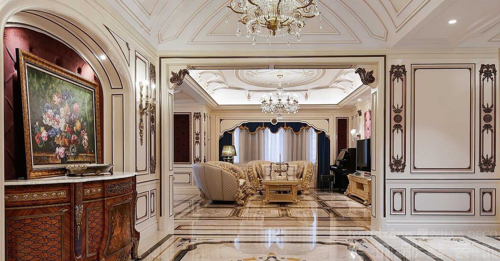 華麗的巨型吊燈于寬闊的挑高空間傾瀉而下,耀眼如輝;溫暖的壁爐燃燒融融暖意,于此刻交織成(chéng)最美的夢境,追憶似水年華,暢談過(guò)往與遠景。