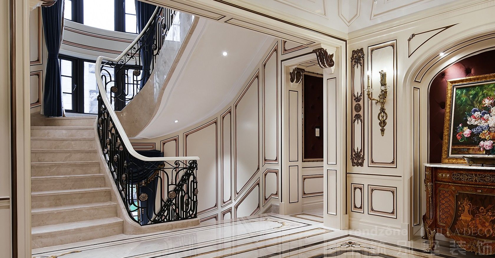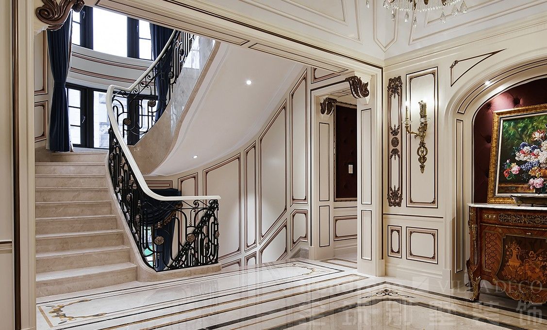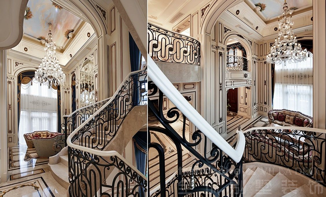 華美的旋轉樓梯線條優美,震人心魄,米白色與黑色流轉于空間之中,軸對(duì)稱的格局突出法式的莊重典雅;吊頂處罕見的中世紀油畫墨寶,記載著(zhe)曆史的唯美和痕迹。